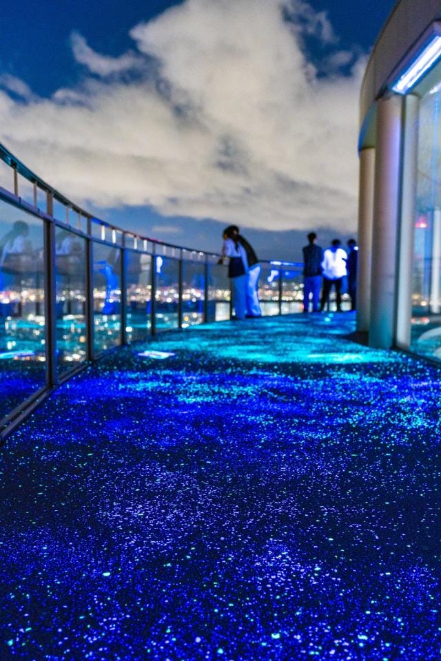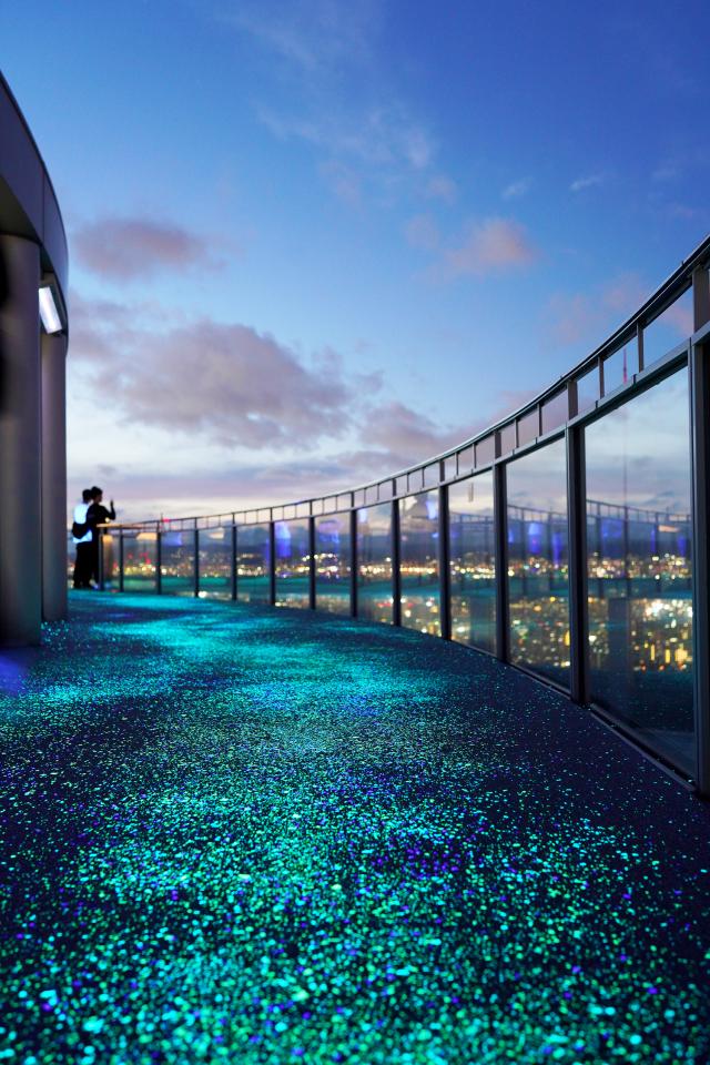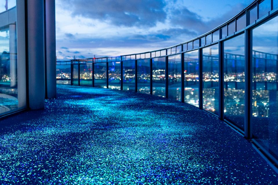 空中庭園展望台の屋上回廊に星雲や流星、惑星など宇宙空間をモチーフにしたデザインを蓄光石で表現。